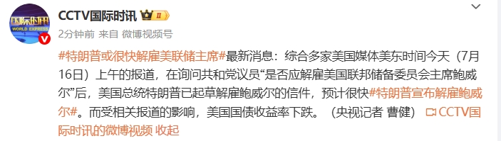 央视记者当地时间16日获悉,一位白宫官员称,美国总统特朗普可能很快解雇美联储主席鲍威尔。