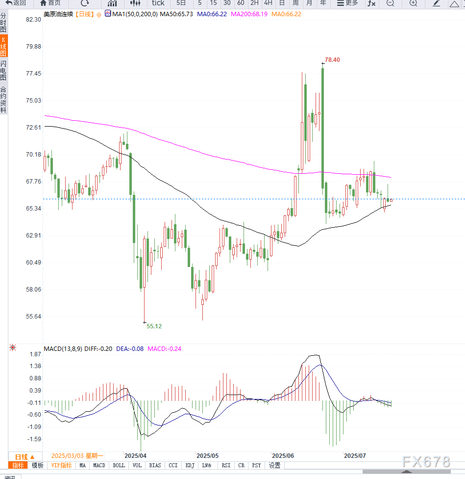 “俄罗斯已对西方制裁建立起一定的免疫机制。”——克里姆林宫发言人佩斯科夫   俄罗斯最大石油生产商Rosneft持有Nayara股份,该公司于周日公开批评此次制裁“毫无根据且非法”,并强调制裁对亚洲国家的能源安全构成直接威胁。   “这些限制措施将破坏区域能源合作,特别是对亚洲市场而言。”——Rosneft官方声明   与此同时,伊朗也成为市场关注焦点。该国外交部表示,将于周五在伊斯坦布尔与英国、法国和德国进行新一轮核谈判。三国此前已警告,如果伊朗不恢复谈判,将重新实施国际制裁。   在美国,石油活跃钻机数量连续下滑。油田服务公司贝克休斯上周五公布的数据指出,美国运营中的钻机数减少至422台,为2021年9月以来最低水平。   尽管供应方面有收紧迹象,但需求预期的悲观情绪仍压制了油价上行空间。欧美之间即将生效的关税措施加剧了这一担忧。据悉,美国将于8月1日对来自欧盟的部分进口商品征收关税。   “我们仍有信心可以与欧洲达成一致,避免严重的贸易紧张。”——美国商务部长卢特尼克   从技术面来看,美国西德克萨斯中质原油(WTI)在日线图上形成窄幅震荡区间,当前价格运行于20日与50日均线之间,显示出多空力量正在胶着。   技术指标方面,RSI指标处于中性区域附近(约50水平),MACD动能柱则趋于收敛,表明短期趋势尚不明朗。若油价上破68美元关口,有望测试70.20美元一线阻力;   相反,若跌破65.30美元支撑,可能下探64.00美元区域。整体来看,WTI正处于整理阶段,需等待宏观消息或供需面催化形成突破方向。