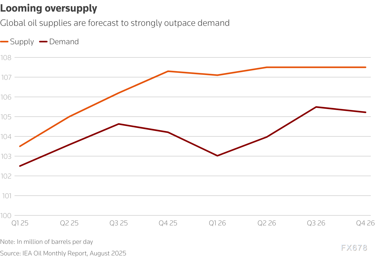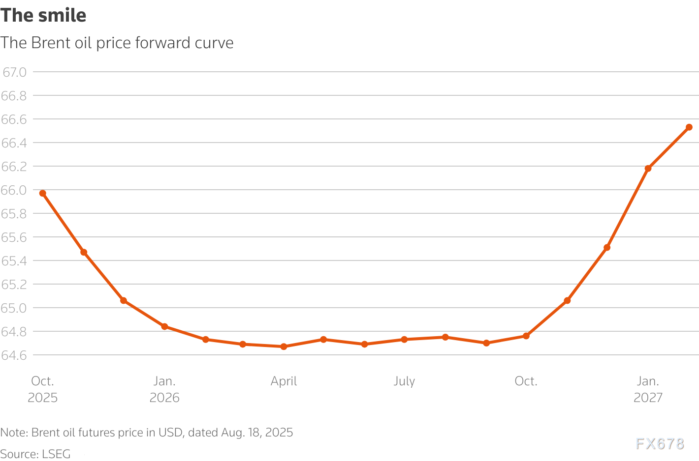 对此,布伦特原油现货价格已有所走软:从7月30日的每桶73美元以上,跌至本周的略低于66美元,这也反映出北半球夏季石油需求的减弱。   但原油期货曲线的远期端却呈现出另一番景象。   远期“微笑”曲线   与其他大宗商品市场类似,石油市场参与者可购买未来数月或数年交割的期货合约,让产油商、炼油厂、消费商和投机者既能对冲风险,也能对价格走势下注。   远期曲线反映了这些预期,主要分为两种形态:   现货溢价(Backwardation):即近期合约价格高于远期合约价格,通常表明市场供应趋紧,会推动产油商增加产量;   期货溢价(Contango):即远期合约价格高于近期合约价格,通常意味着供应过剩,此时储存原油比继续开采更具经济吸引力。   鉴于众多专家都指出当前石油市场将出现严重供应过剩,投资者本应预期2026年全年布伦特原油远期曲线会呈现陡峭的期货溢价形态。   但实际情况是:从近期的10月合约到2026年3月合约,曲线呈明显的现货溢价;2026年3月至9月期间基本持平;之后才转向大幅期货溢价。最终形成的这种形态,被称为远期“微笑”曲线。   这种形态较为罕见且令人困惑。若市场确实将面临大规模供应过剩,未来数月交易者很可能需要在储油罐中储存更多原油,极端情况下甚至可能需要用油轮储油。   这意味着,油价可能即将迎来大幅回调。   投资者对“微笑曲线”的乐观心态   投资者对布伦特原油远期曲线的“微笑”形态表现出一种谨慎乐观的心态。这种心态源于对OPEC+干预能力的信心以及对地缘政治风险的复杂预期。投资者可能押注OPEC+会在供应过剩加剧前重新实施减产,以避免油价进一步下滑。这种预期在一定程度上解释了远期曲线为何未完全反映IEA和EIA预测的库存累积。这种乐观可能低估了OPEC+内部的分歧以及非OPEC+产油国(如巴西、加拿大)增产的冲击。
