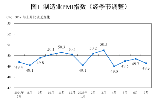 一、中国制造业采购经理指数运行情况    7月份,制造业采购经理指数(PMI)为49.3%,...