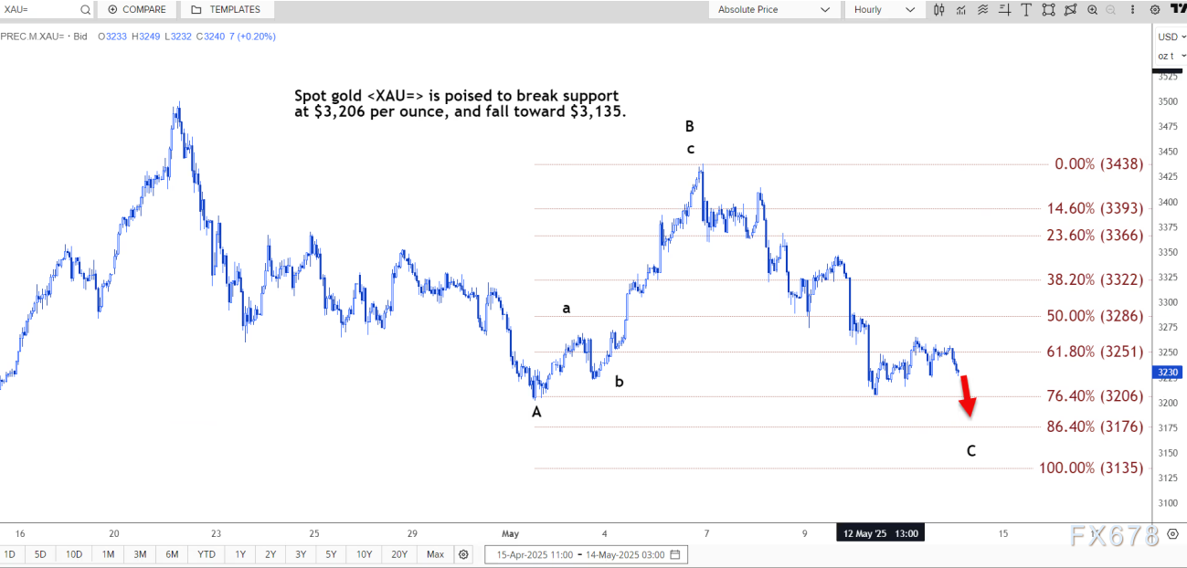 周五(北京时间5月16日),现货黄金交投于3246.20...